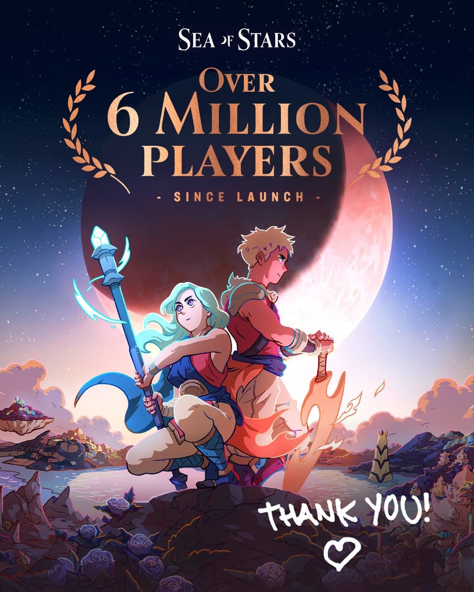 И эта база продолжает расти: на платформе BlueSky студия Sabotage показала, что со дня запуска в прошлом году в Sea of Stars сыграли 6 миллионов человек. Это означает, ещё один миллион игроков появился с марта 2024 года.
