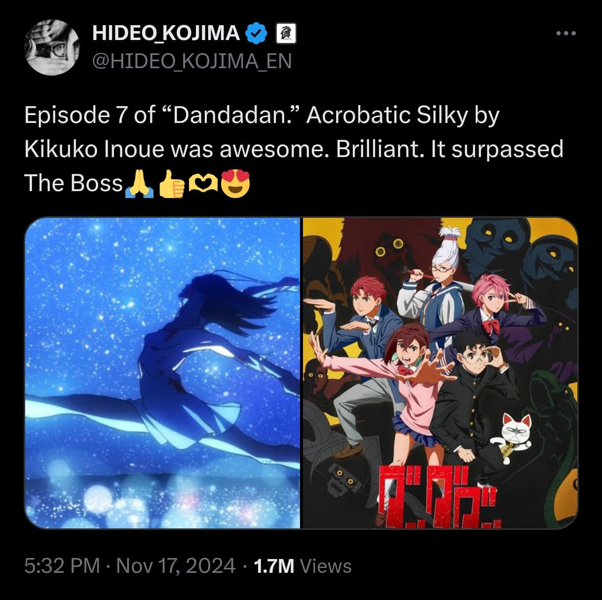 В Twitter/X Кодзима написал: «Эпизод 7 "Дандадан". Акробатка Сара (Silky) в исполнении Кикуко Иноуэ была потрясающей. Блестяще. Это [эпизод] превзошел Боссса».