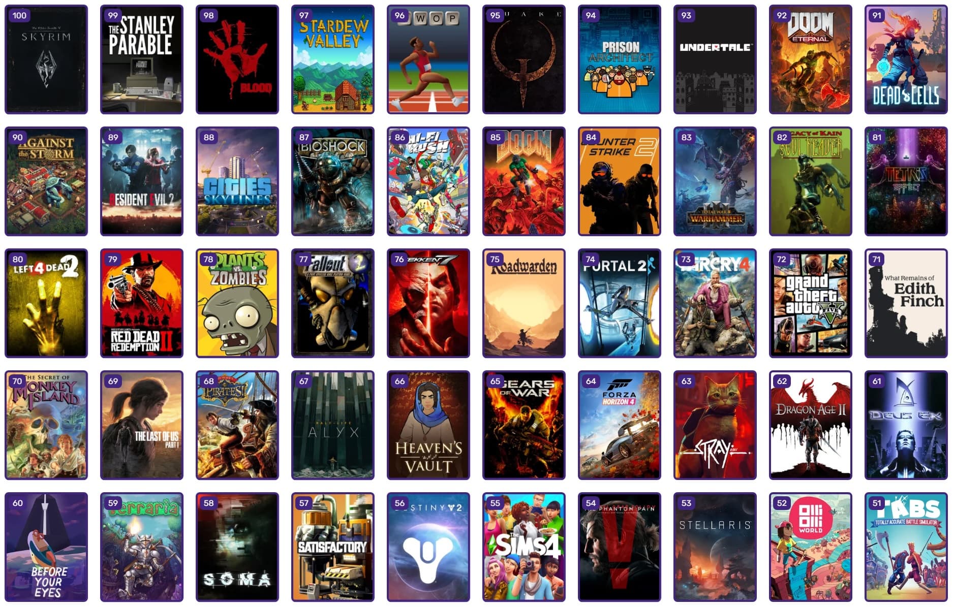 Редакция утверждает, что данный список - это 100 игр высочайшего качества, и свидетельством выносливости ПК стало включение игры, выпущенной 34 года назад, и самой новой, которой всего несколько месяцев.