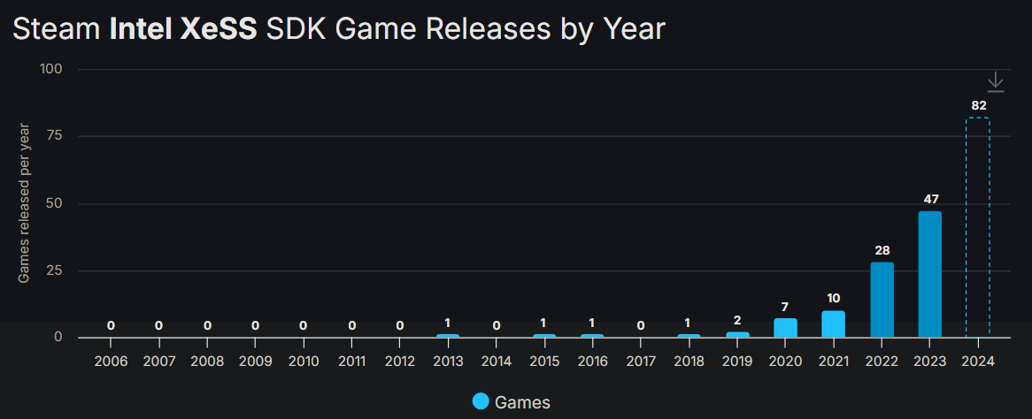 На платформе Steam насчитывается 201 игра, поддерживающая технологию масштабирования от Intel. Особенно примечательно, что большая часть этих игр добавила поддержку XeSS именно в 2024 году, что говорит о растущем интересе к технологии.