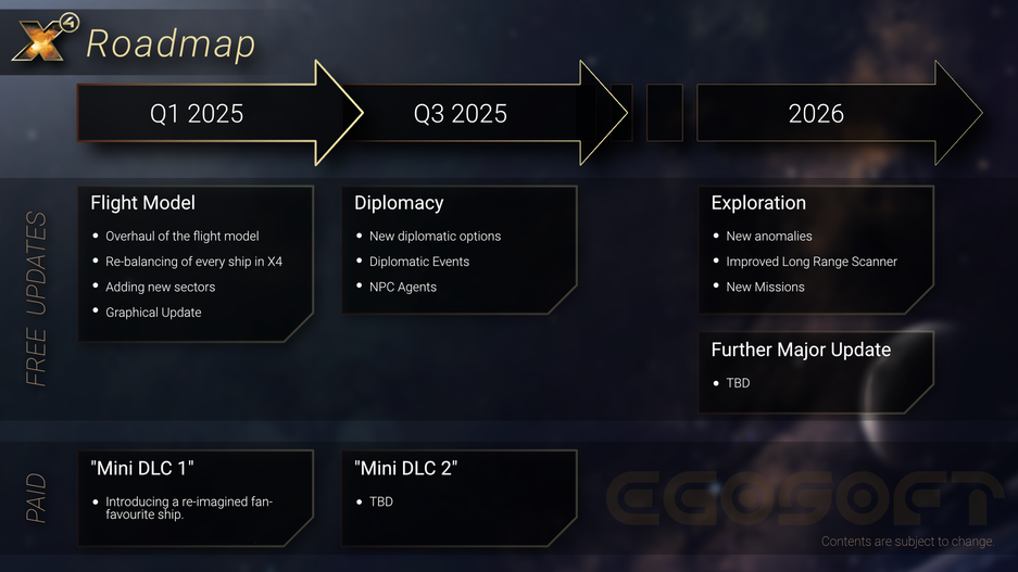 На первый квартал 2025 года запланировано Обновление модели полётов X4 Foundations. К созданию игры привлекли Джона Притчетта, бывшего старшего программиста по физике в команде разработчиков Star Citizen — он будет возглавлять работу по преобразованию модели полетов в X4: