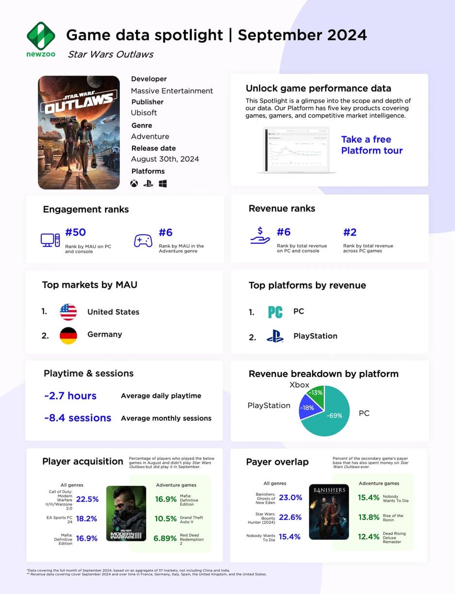В отчете аналитиков Newzoo говорится, что Star Wars Outlaws занимала второе место по общему доходу среди игр для ПК в сентябре 2024 года, уступив лишь Black Myth: Wukong.