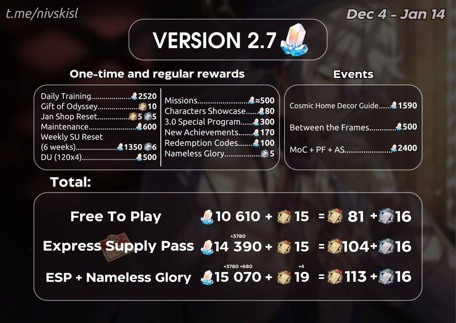 Поклонники Honkai Star Rail готовится осваивать контент 2.7 и различные энтузиасты пытаются оценить потенциальные награды. В сообществе «Honkai: Star Rail | Миря» обратили внимание на вычисления nivskisl— результаты были оформлены в формате таблицы.