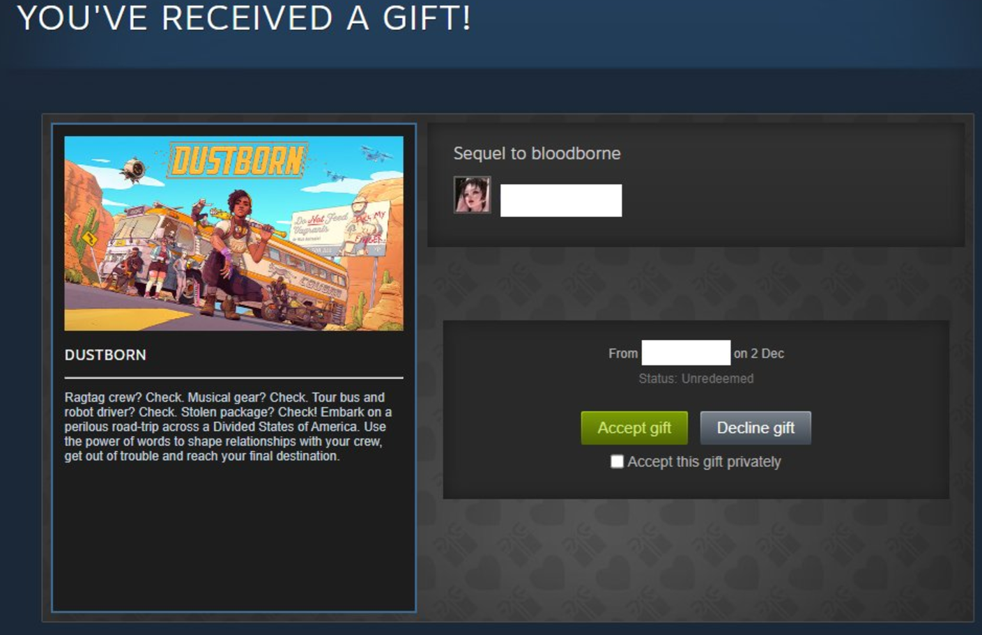 Тем не менее у получателя есть возможность (при желании) отказаться от подобного подарка, в таком случае купившему Dustborn просто должны вернуть деньги.