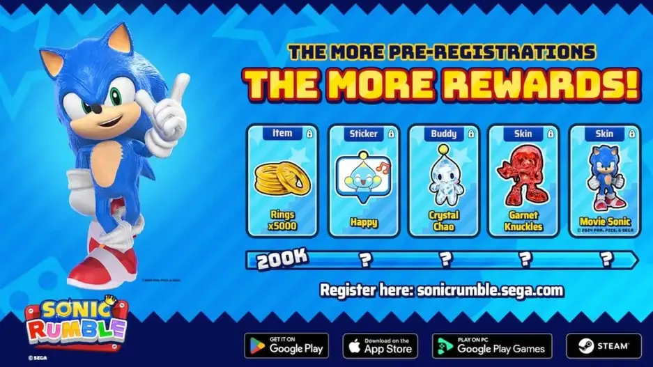 Кампания предрегистрации включает награды, которые будут разблокированы по мере достижения определённого количества участников. Первым достижением стало 200 000 регистраций, что позволило игрокам получить 5000 игровых колец — внутриигровую валюту. Среди будущих наград — эксклюзивные скины, такие как Garnet Knuckles и Movie Sonic.