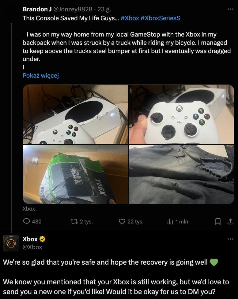 Официальный профиль Xbox отреагировал на новость. Сотрудники Microsoft пожелали игроку здоровья и попытались связаться с ним, чтобы отправить новую консоль Xbox:
