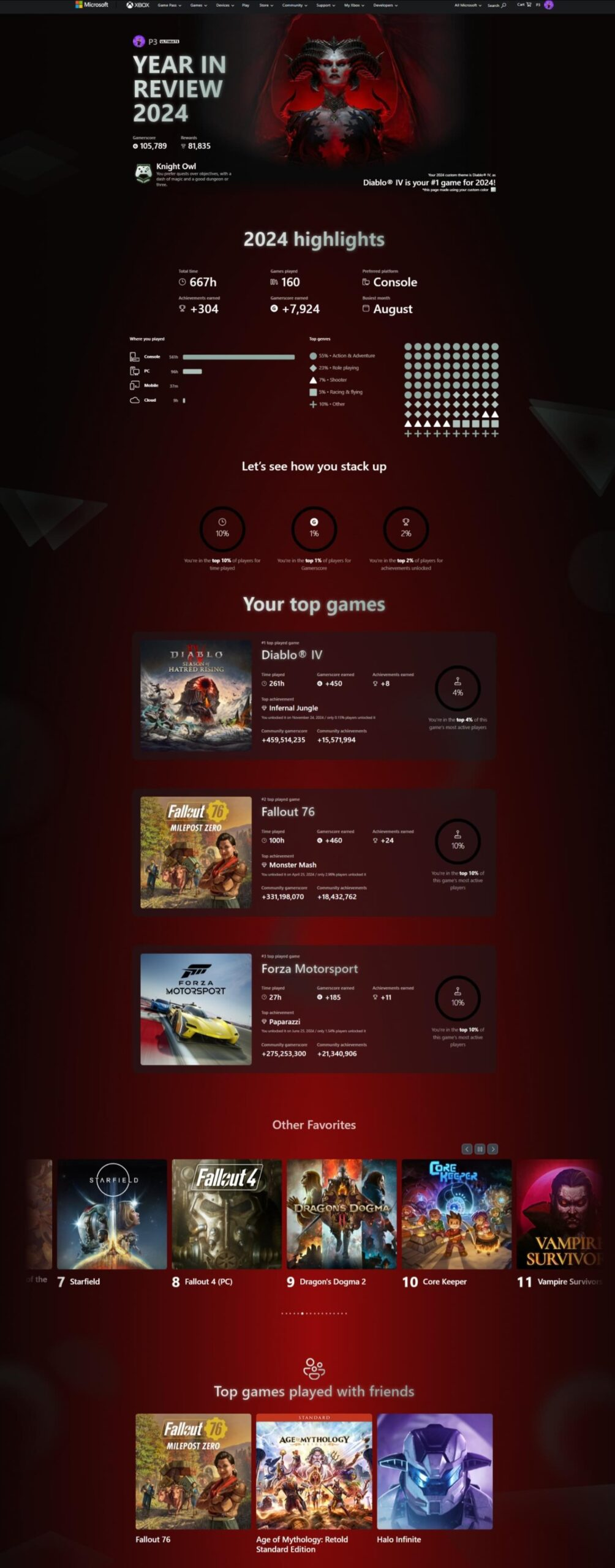 За год в экосистеме Xbox наиграно 667 часов, попробовал 160 игр. Основная платформа — Xbox (560+ часов), ПК — 96 часов, а в «облаке» он провёл порядка 5 часов.