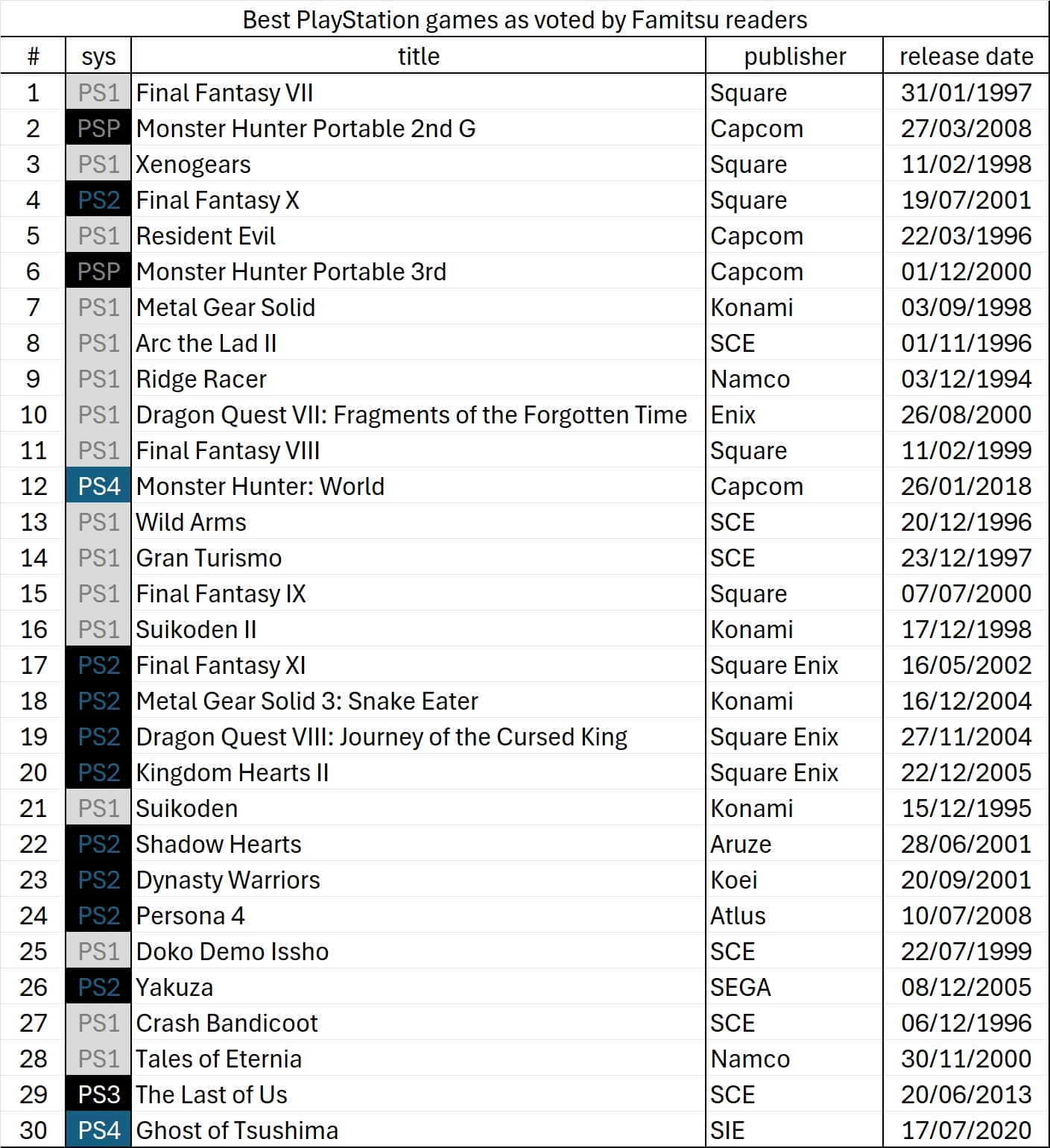 В честь 30-летия PlayStation японский игровой журнал Famitsu провел опрос среди своих читателей, чтобы определить 30 лучших игр всех времен для PlayStation.