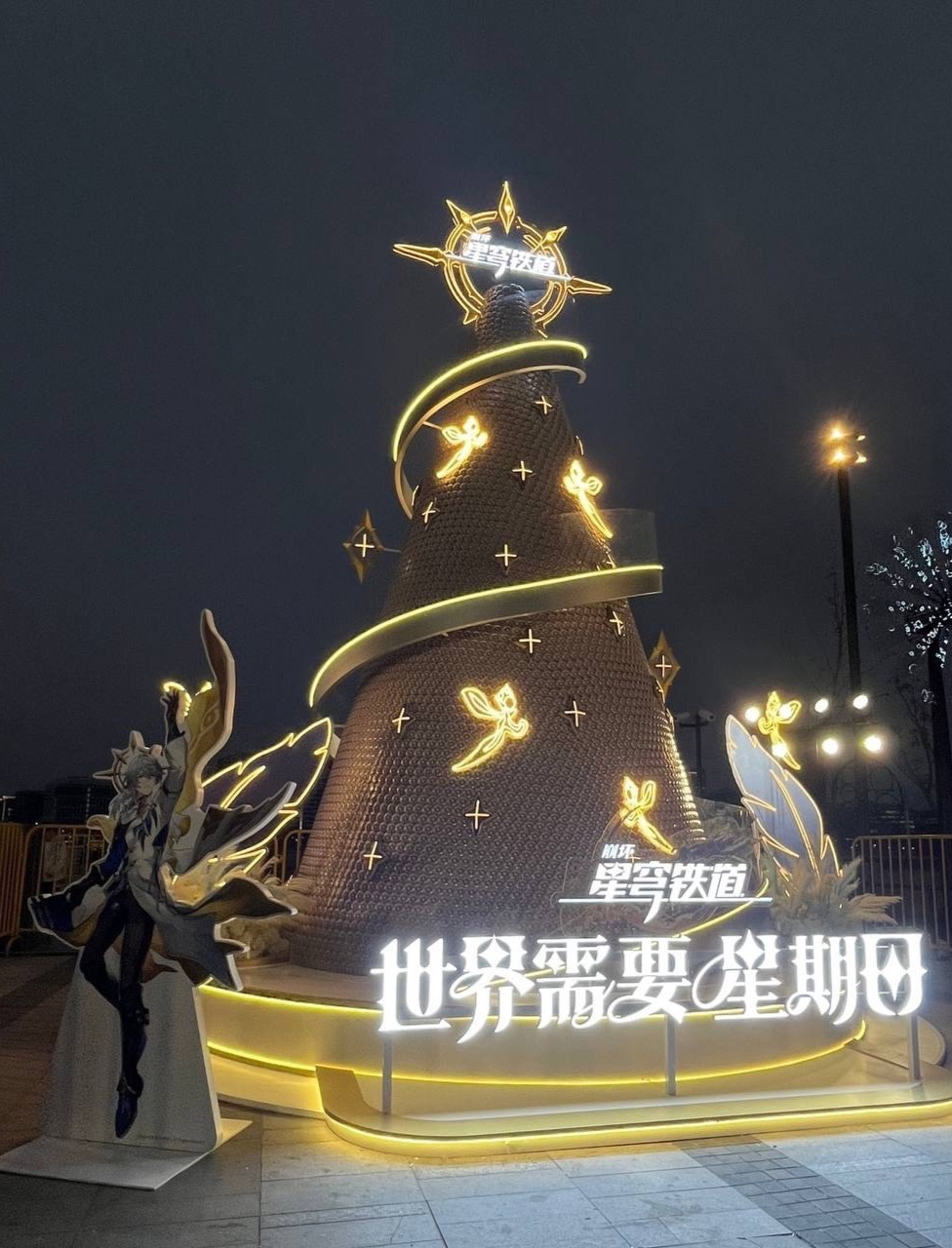 На общем плане можно увидеть, что рядом с оформленной в стиле HSR ёлкой стоит Воскресенье (стенд). В ночное время суток картина дополняется подсветкой.