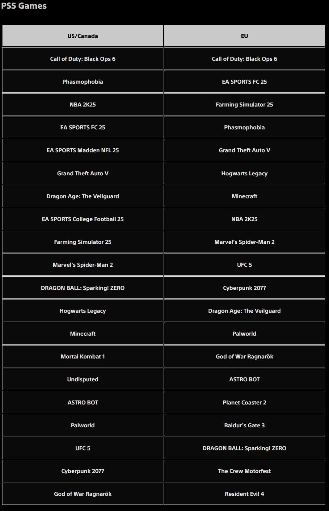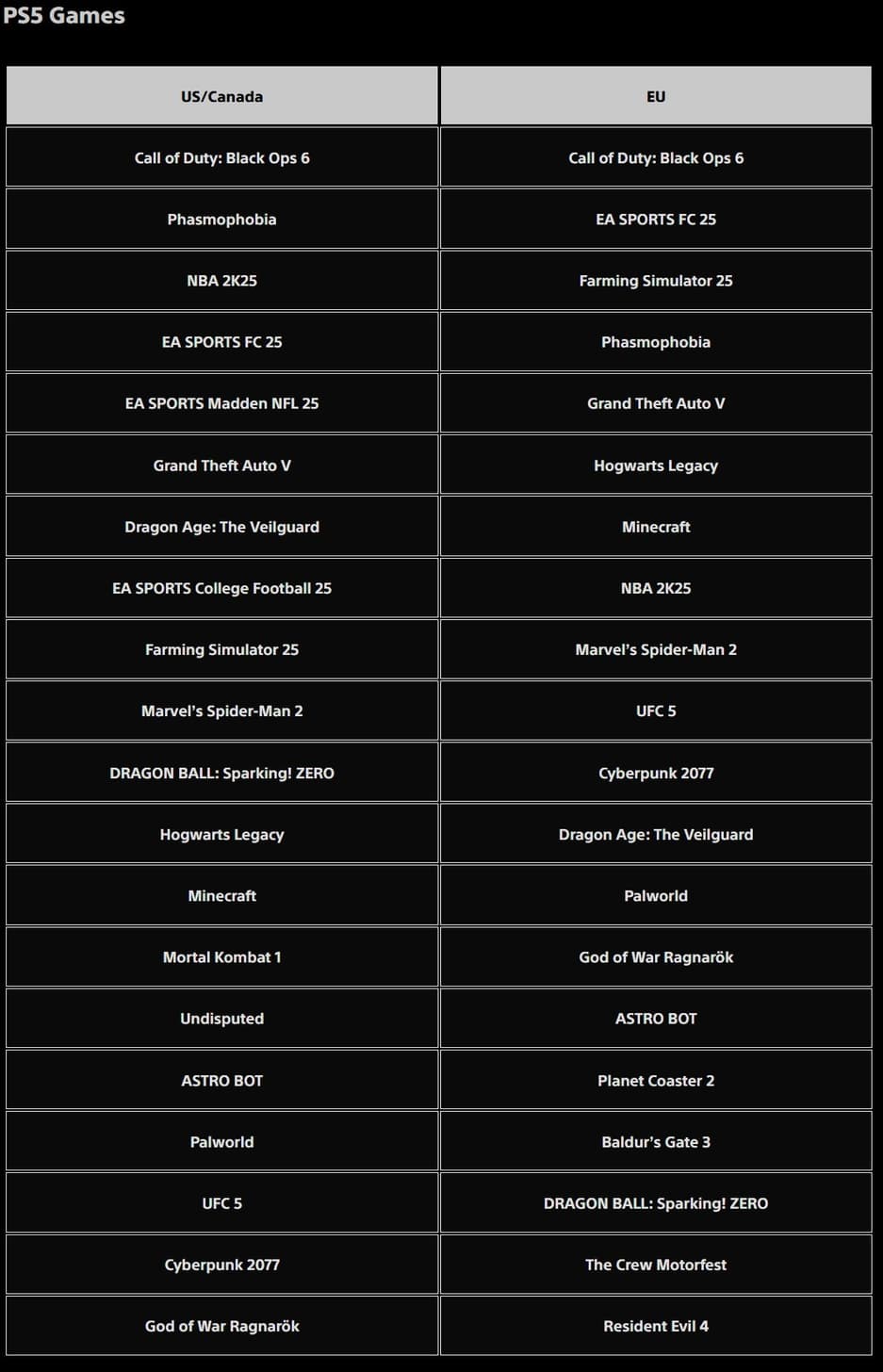 GTA 5 не нуждается в комментариях, но стоит отметить Dragon Age: The Veilguard. Вроде бы и неплохо, но игра такого уровня должна быть в верхнем эшелоне. Особенно если учесть, что проект BioWare появился на рынке недавно (7-е место в США и Канаде и 12-е в Европе).
