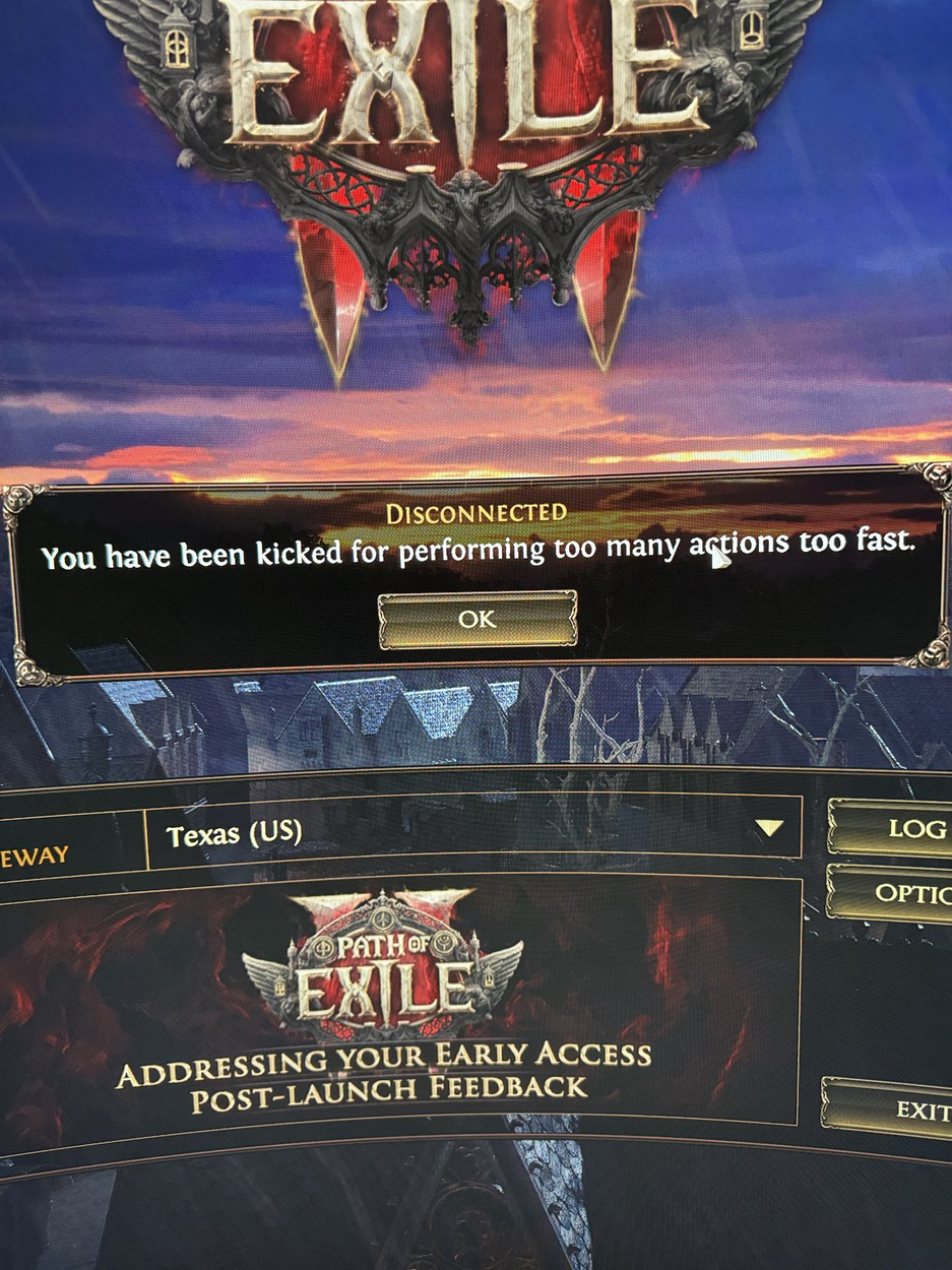 Увлечённый геймер уверяет, что пока даже не использовал макросы. Он опубликовал скриншот уведомления в социальной сети: «Вас кикнули за слишком быстрое выполнение многих действий» — эта ошибка должна быть хорошо знакома давним игрокам в оригинальную Path of Exile.