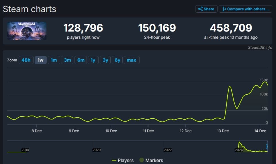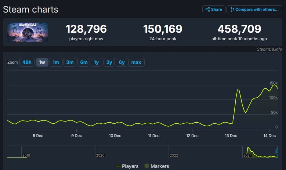 В течение декабря Helldivers 2 редко превышала отметку в 30 тысяч одновременных игроков, а в большинстве дней не достигала и 20 тысяч, но после выхода обновления аудитория бросилась в игру.