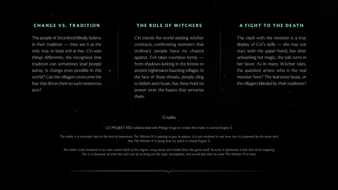 «Трейлер предварительно отрендерен в нашей собственной сборке движка, с использованием ассетов и моделей из самой игры. Таким образом, он представляет собой образ, к которому мы стремимся. Это демонстрация того, что эта технология может сделать, чтобы передать стиль, атмосферу и общее ощущение, которое мы хотим получить от The Witcher 4».