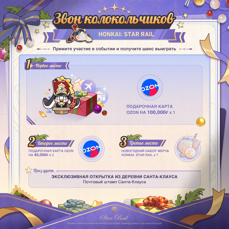 Финал конкурса-коллаба Honkai Star Rail x Visit Rovaniemi запланирован на 20 декабря 2024 года. Призовой фонд — подарочные карты OZON и наборы мерча HSR.