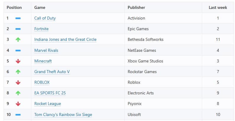 Новая приключенческая игра Indiana Jones и and the Great Circle ворвалась в тройку самых популярных игр на Xbox, сместив Minecraft на четвёртое место рейтинга.