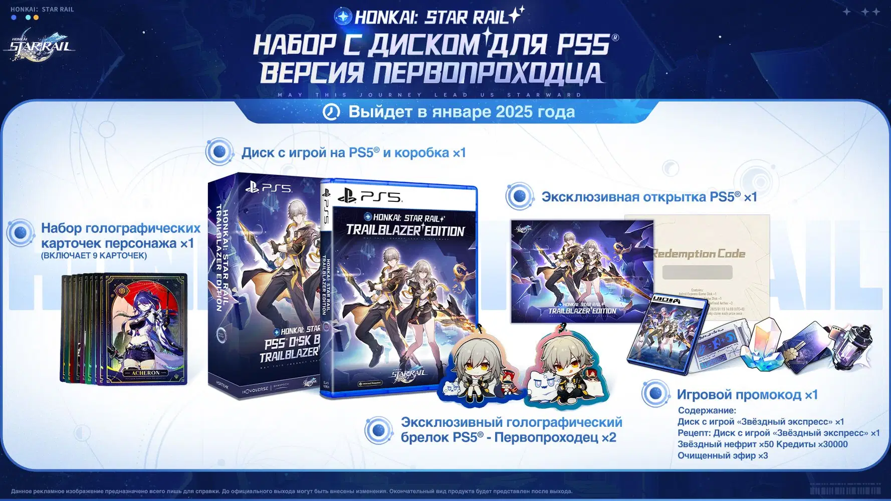 В комплект «Honkai: Star Rail Trailblazer Edition PS5 Physical Disc Bundle» (или «Версия Первопроходца») помимо самой игры входят разные цифровые бонусы для игры и «физические» подарки, например набор голографических карточек.