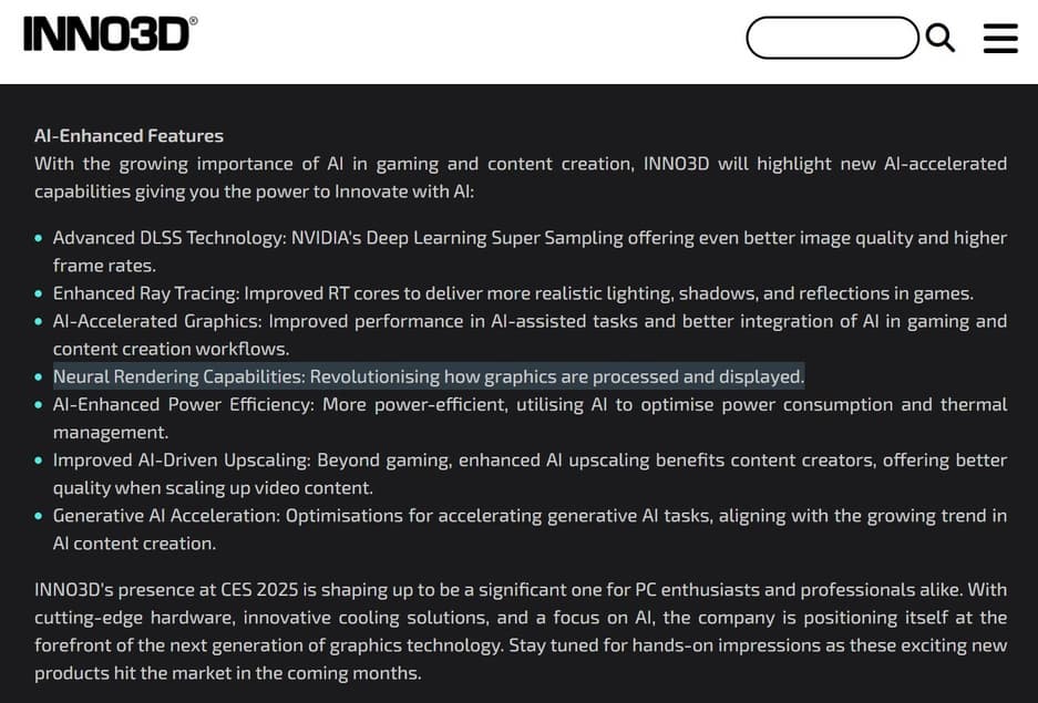 Эти функции в конечном итоге могут быть связаны с текущей серией RTX 40, но это пресс-релиз для CES 2025, и Inno3d считает, что они относятся к новым видеокартам.