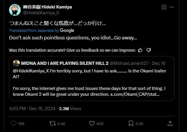 «Я очень прошу прощения, но не могу не спросить... был ли использован ИИ при работе над трейлером Okami? Извините, но интернет последнее время вызывает у меня недоверие из-за всех этих технологий. Уверен, что Okami 2 будет потрясающей под вашим руководством».