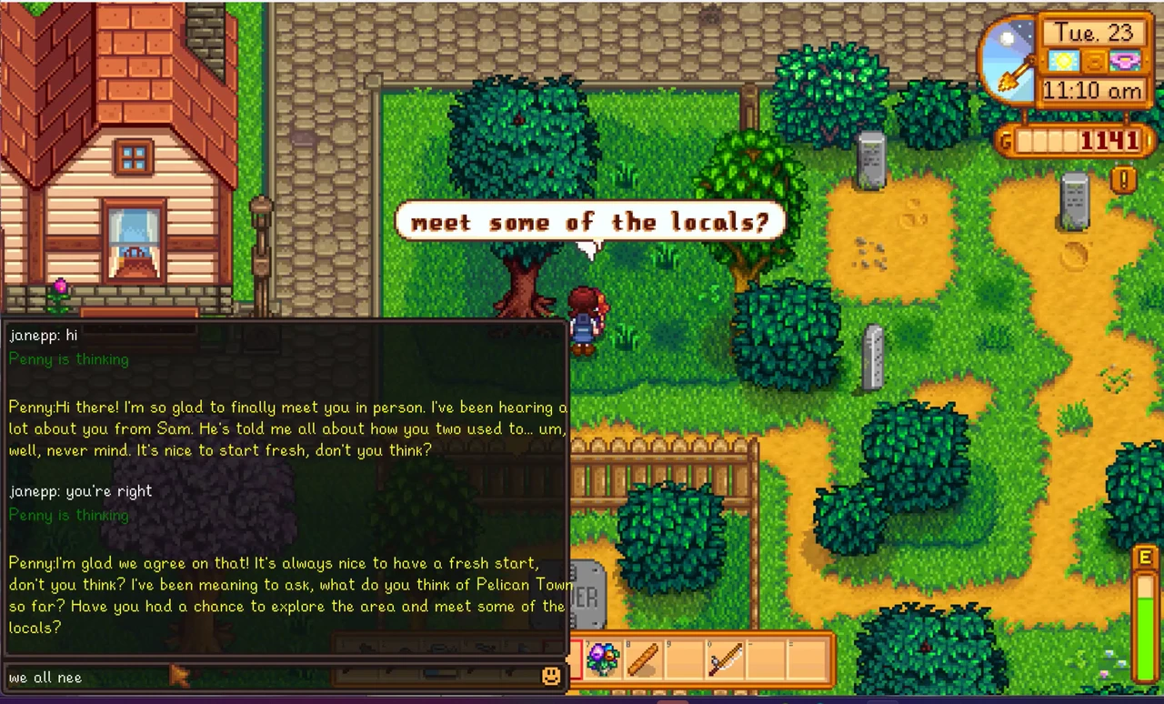 Техно-энтузиаст решил освежить Stardew Valley, привнеся в игровой мир возможности искусственного интеллекта. Благодаря этому NPC научились поддерживать диалог с игроком (на разных языках), была предусмотрена возможность устроить собственную историю — выстраивать отношения при помощи «естественных разговоров».
