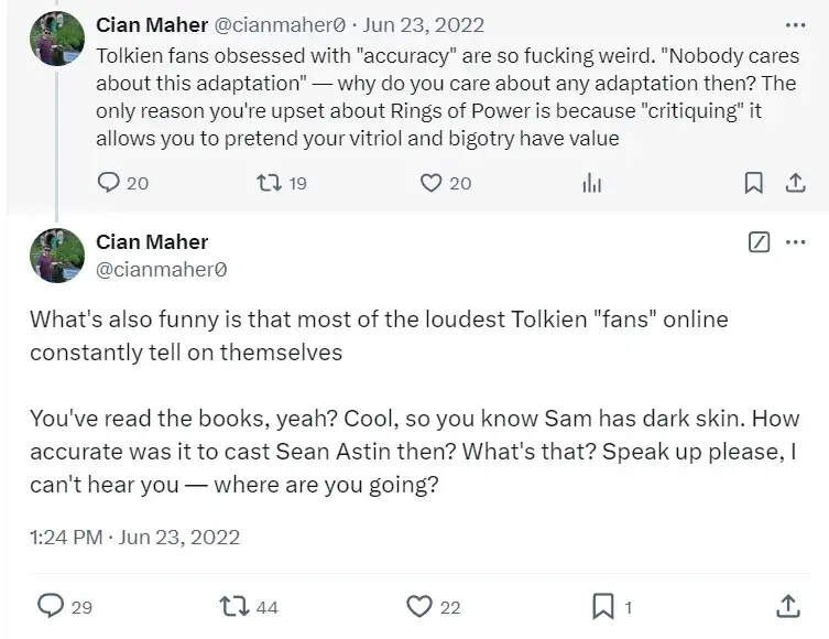 Что еще забавно, так это то, что большинство самых громких "фанатов" Толкина в сети постоянно выдают свое незнание первоисточника: «Вы же читали книги, да? Круто, значит, вы в курсе, что у Сэма темная кожа. Насколько точным был выбор Шона Эстина? Что это? Говори громче, пожалуйста, я тебя не слышу — куда ты уходишь?», — писал Махер в июне 2023.