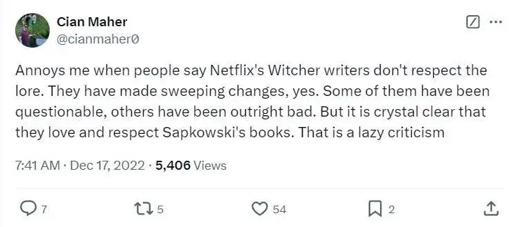 «Меня раздражает, когда люди говорят, что авторы "Ведьмака" от Netflix не уважают лор. Они внесли радикальные изменения, да. Некоторые из них были сомнительными, другие были откровенно плохими. Но совершенно ясно, что они любят и уважают книги Сапковского. Это ленивая критика», — заключил он в декабре 2022.