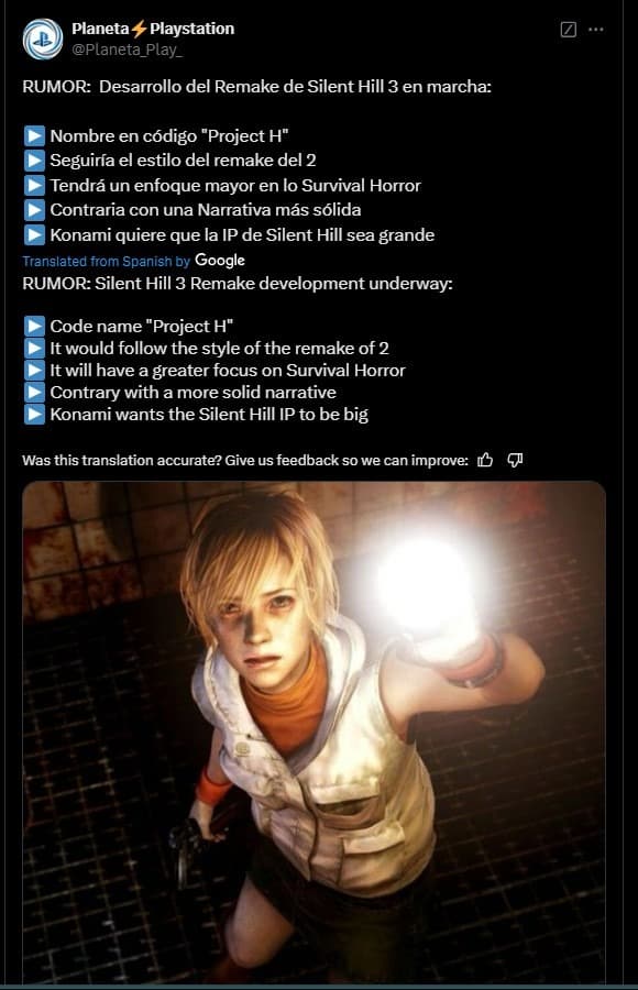Информатор @Planeta_Play_ утверждает, что под кодовым названием Project H скрывается ремейк Silent Hill 3 в стиле обновленной версии второй части. Но на этот раз разработчики сосредоточатся на элементах хоррор-выживания, сохраняя фирменный нарративный стиль.