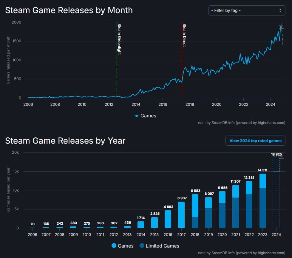 Сервис SteamDB показал, что в 2024 году в Steam выпущено 18 825 игр. Это значительно больше, чем в прошлом году, когда в 2023 году на платформе вышло 14 311 продуктов. В отчёт сервиса также вошла информация о самых рейтинговых играх по версии игроков. Интересно, что наибольшее количество наименований выпустили в октябре - тогда в Steam вышла 1 901 игра.