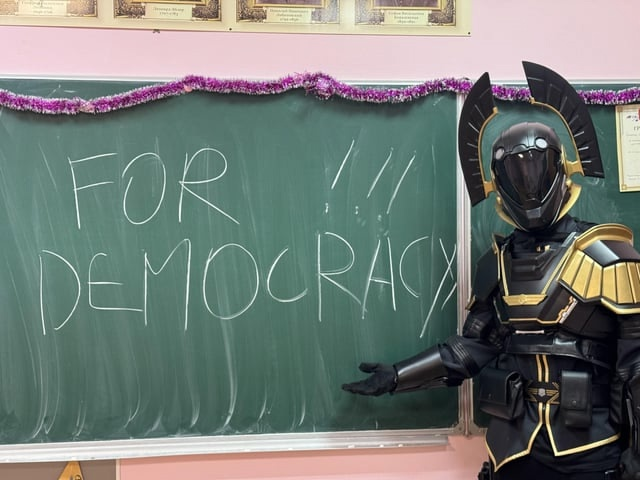 «Свой образ он подкрепил гордой надписью "За демократию!" на доске».