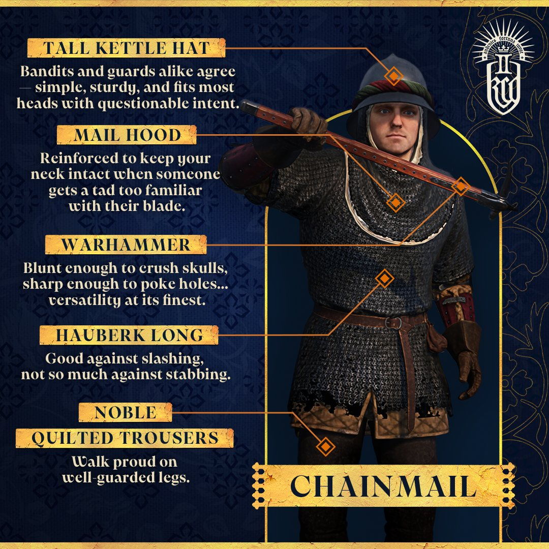 - Chainmail / Кольчуга — Шея будет защищена капюшоном; броня поможет против рубящих ударов, но слаба перед колющими;