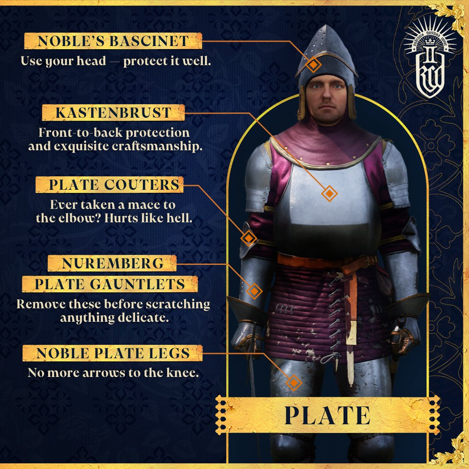 - Plate / Пластинчатый доспех — Обеспечивает хорошую защиту и разработчики отдельно отметили, что в колено стрела не попадёт (фанаты Skyrim быстро поняли, к чему это уточнение — вспомнили печальную историю стражника, которому стрела попала в колено).