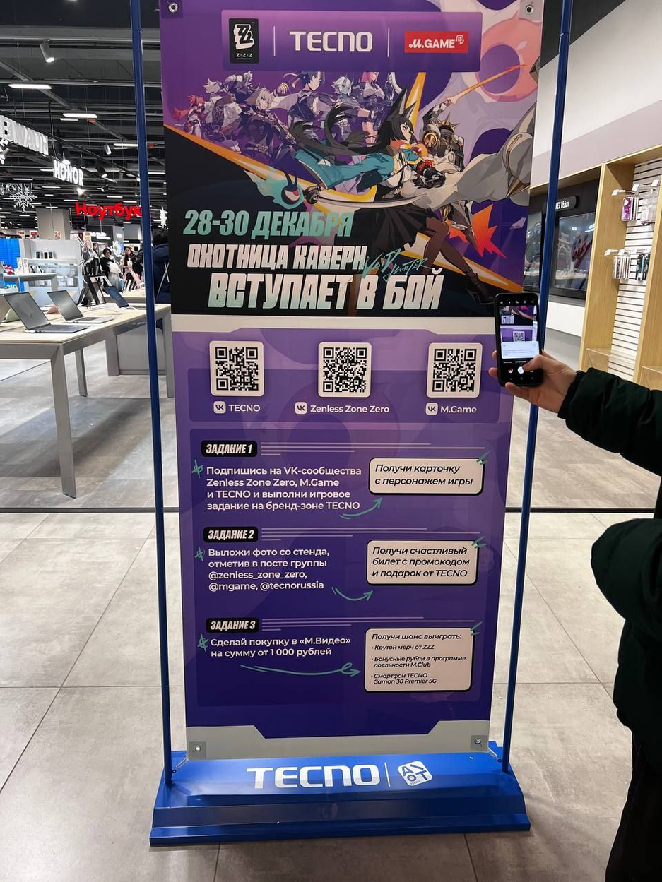 Устроили коллаб Zenless Zone Zero x M.Game x Tecno — организовали бренд-зону, где посетители могут получить мерч Tenco и ZZZ, а также промокод на покупку смартфона.