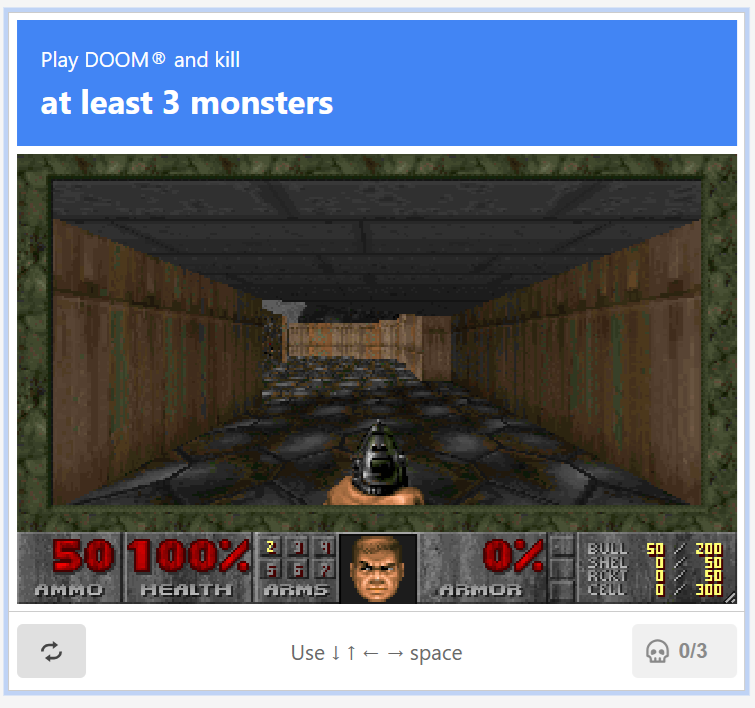 Для прохождения DOOM CAPTCHA необходимо убить по меньше мере трёх демонов, при этом сделать это необходимо в режиме Nightmare — далеко не каждый человек способен пройти такую проверку с первой попытки.