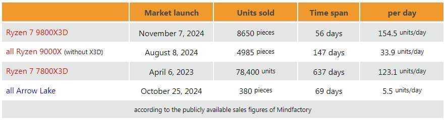 По данным немецкого ритейлера Mindfactory, с момента выхода продано 8650 единиц 9800X3D, что превышает совокупные продажи всех Ryzen 9000X (не-X3D). Несмотря на проблемы с запасами, AMD продолжает доминировать на рынке процессоров, занимая все десять топовых позиций в продажах.
