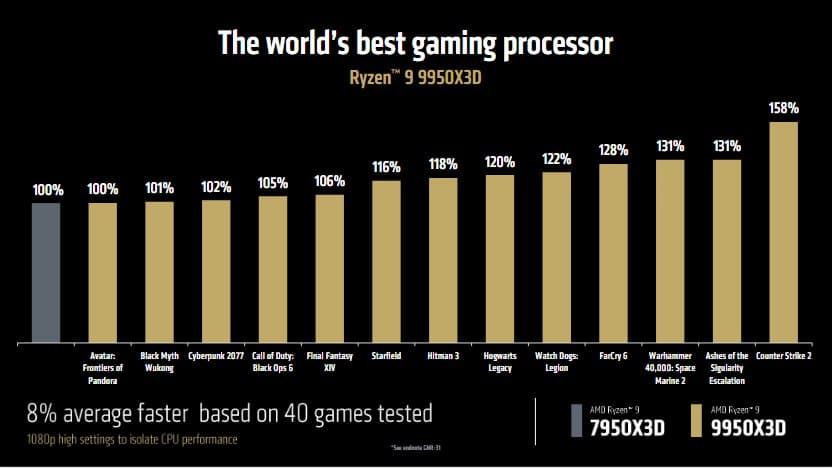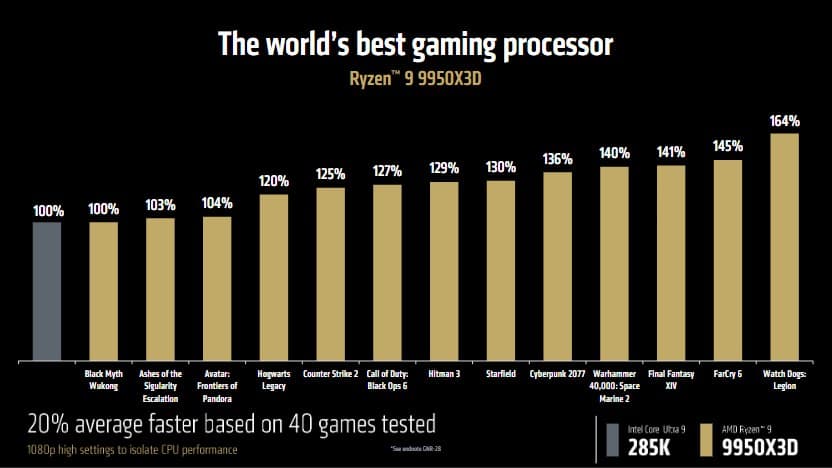 Флагман линейки, Ryzen 9 9950X3D, имеет 16 ядер, 32 потока и частоту до 5.7 ГГц. AMD заявляет, что новинка на 8% производительнее предыдущей модели 7950X3D в играх и на 13% в рабочих приложениях. Более того, этот процессор обходит новейший «синий» флагман Intel Core Ultra 9 285K в играх в среднем на 20%, а в некоторых тайтлах — до 64%.