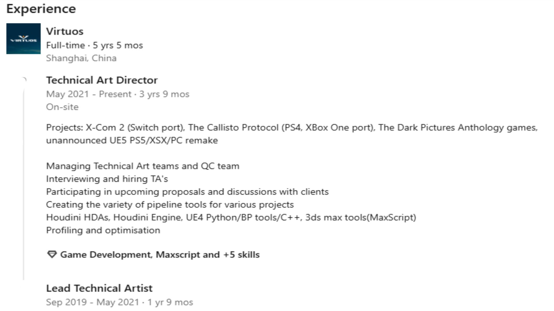 Timur222 указал на профиль технического арт-директора Virtuos Games — в нём упоминается некий неанонсированный проект на современном движке Unreal Engine 5, а среди платформ ПК, PS5, Xbox Series X|S.