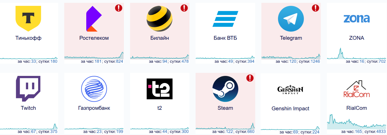 На сервисе downdetector.su можно заметить активизацию жалоб в таких категориях как Genshin Impact, Steam, Twitch и не только — также есть сообщения о проблемах с работой ряда сотовых операторов, Telegram, отечественных стриминговых сервисов, банков.