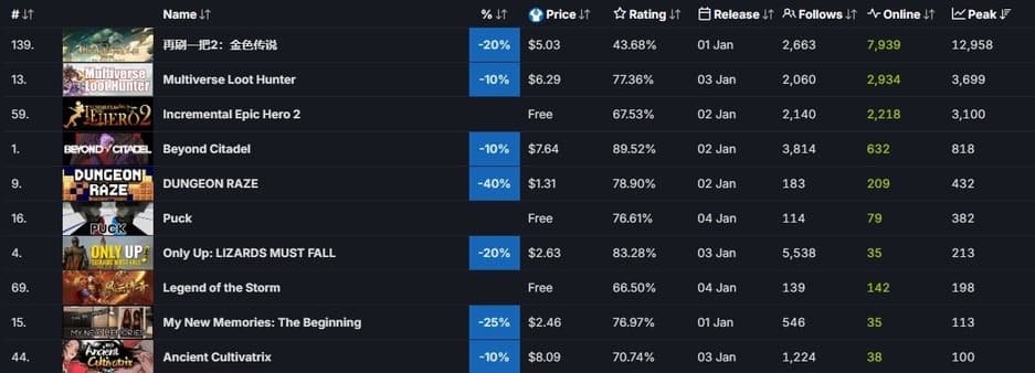 Список игр, которые набрали более 100 игроков в первые дни 2025 года, ниже.