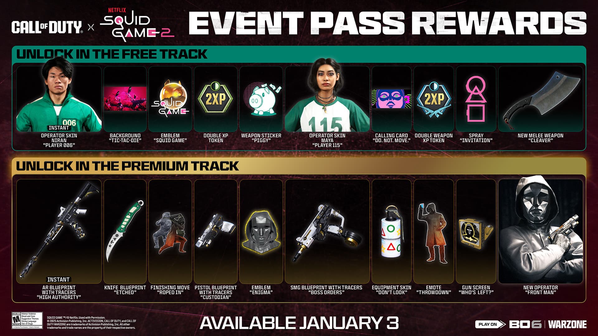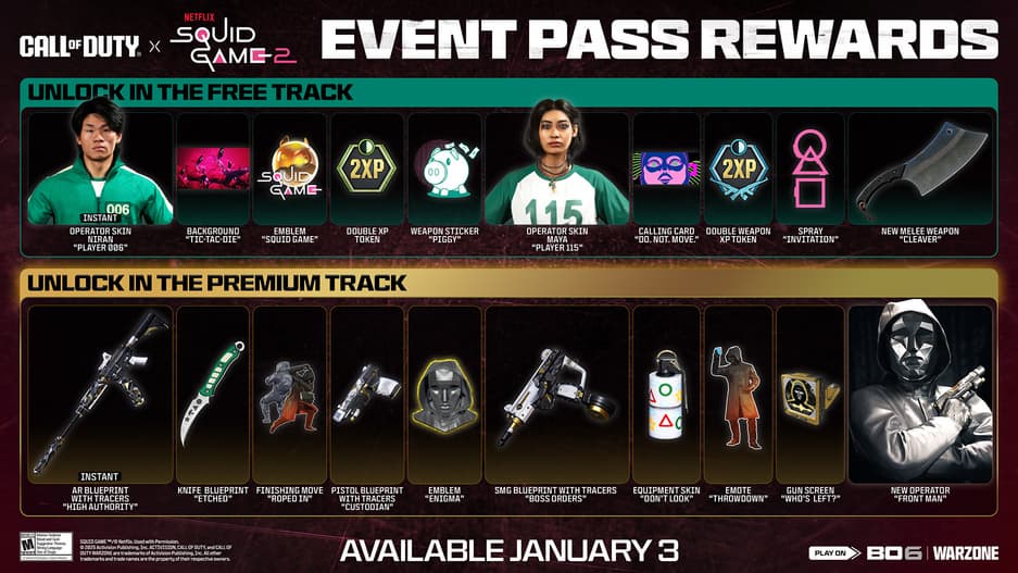 Игроки могут приобрести бандлы с обликами для оперативников в стиле организаторов «Игры в кальмара», обслуживающего персонала, участников, VIP-гостей, а также механической куклы. Помимо того, в игру был добавлен отдельный пропуск за 10 долларов для ивента, в котором представлены дополнительные награды.