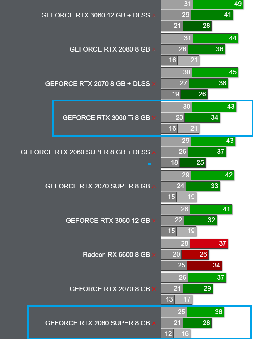 С GEFORCE RTX 3060 Ti можно будет получить более 30 FPS на 1440p, а GEFORCE RTX 2060 SUPER хватит для 30 FPS при разрешении 1080p. Для игры в 4K пригодится видеокарта уровня GEFORCE RTX 3080.