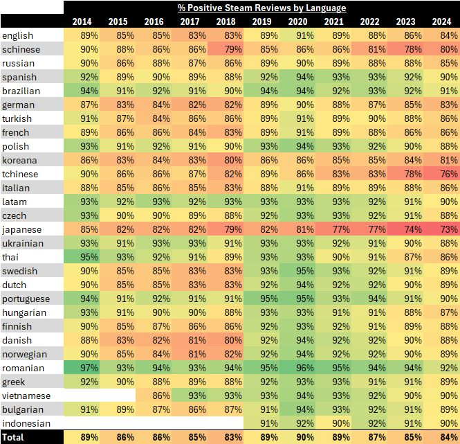 Недавно директор по развитию бизнеса студии World's Edge поделился результатами исследования. Уилл Маккахилл (Will McCahill) оценивал уровень позитивности обзоров Steam за период с 2014 по 2024 годю