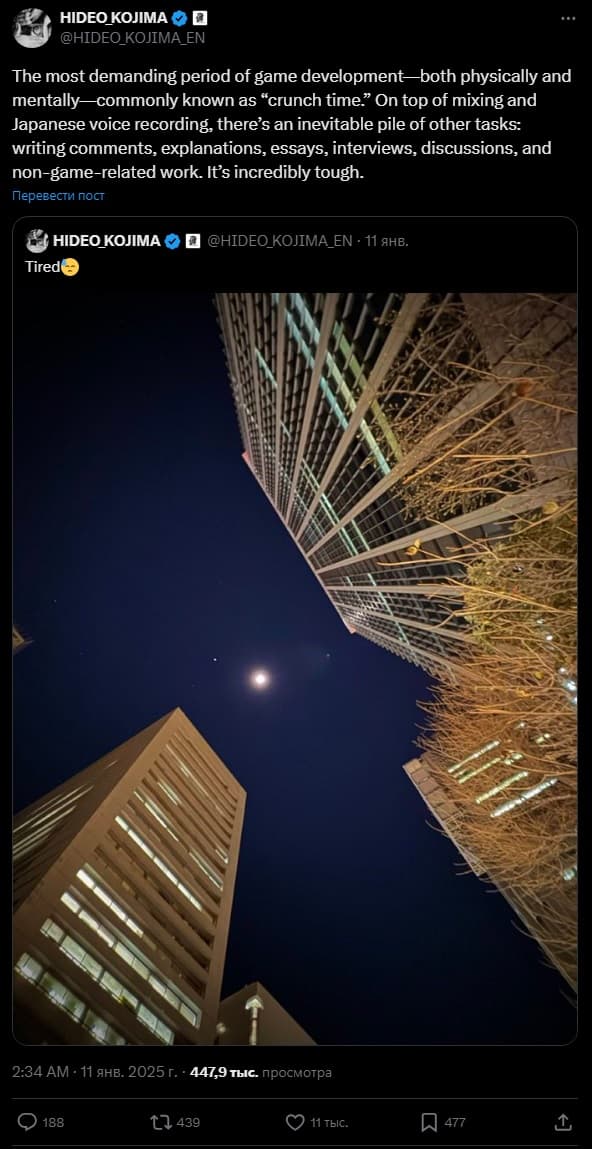 Геймдизайнер Хидео Кодзима поделился в соцсетях, насколько изнурительным стал процесс завершения разработки Death Stranding 2. По его словам, заключительный этап, «crunch time» (время переработок или кранчей), выматывает как физически, так и морально.