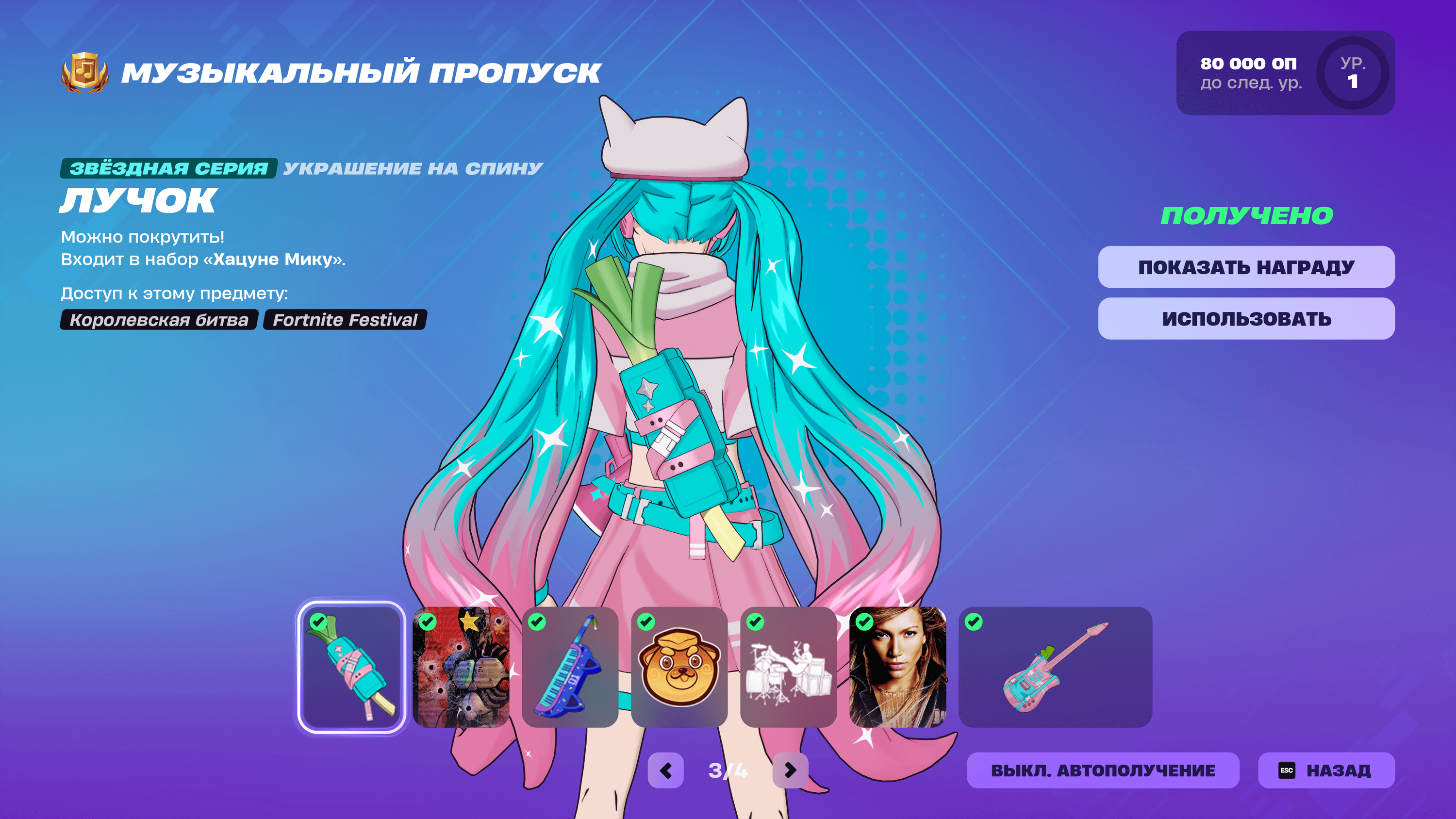 Игроки в Fortnite смогут получить экипировку Хацунэ Мику, инструменты и другие награды музыкального пропуска (стоит 1400 В-баксов / можно получить по подписке «Отряд Fortnite»). Будет возможность открыть джем-трек M@GICAL☆CURE! LOVE SHOT!, созданный SAWTOWNE при участии Хацунэ Мику, в качестве одной из последних наград пропуска.