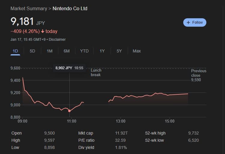 После анонса Switch 2 стоимость ценных бумаг Nintendo устремилась вниз. Дебютный тизер нового игрового устройства оставил разочарованными не только многих игроков, но и инвесторов.
