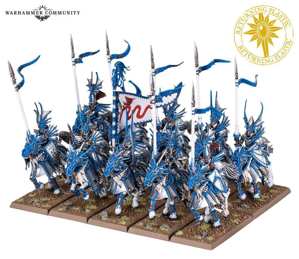 Были представлены миньки драконьих принцев, серебряных шлемов, лорда на драконе, боевых магов, морских стражей, стражей Феникса, белых львов, сестер Авелорна, копейщиков, лучников, колесниц и болтометов.
