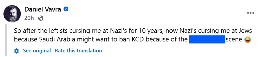 «Итак, после того, как леваки на протяжении 10 лет обзывали меня "нацистом", теперь нацисты обзывают меня "евреем" из-за того, что Саудовская Аравия может захотеть забанить KCD из-за [специфической сцены] :D».
