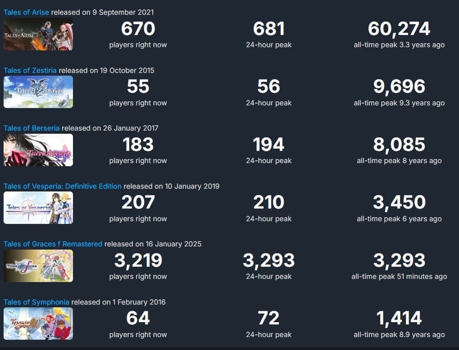 Tales of Graces f Remastered показала чуть ли не худший результат среди игр серии за последние 10 лет. Пиковое количество игроков составило 3200 человек. В списке проектов Tales на портале SteamDB видно, что только у Tales of Symphonia, простого порта с GameCube, выпущенного в 2016 году, был худший пик игроков.