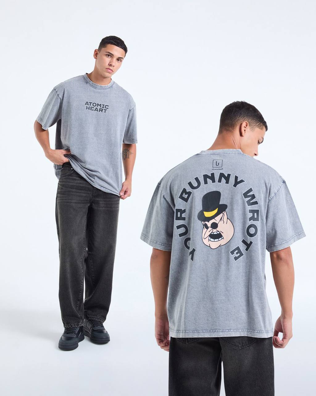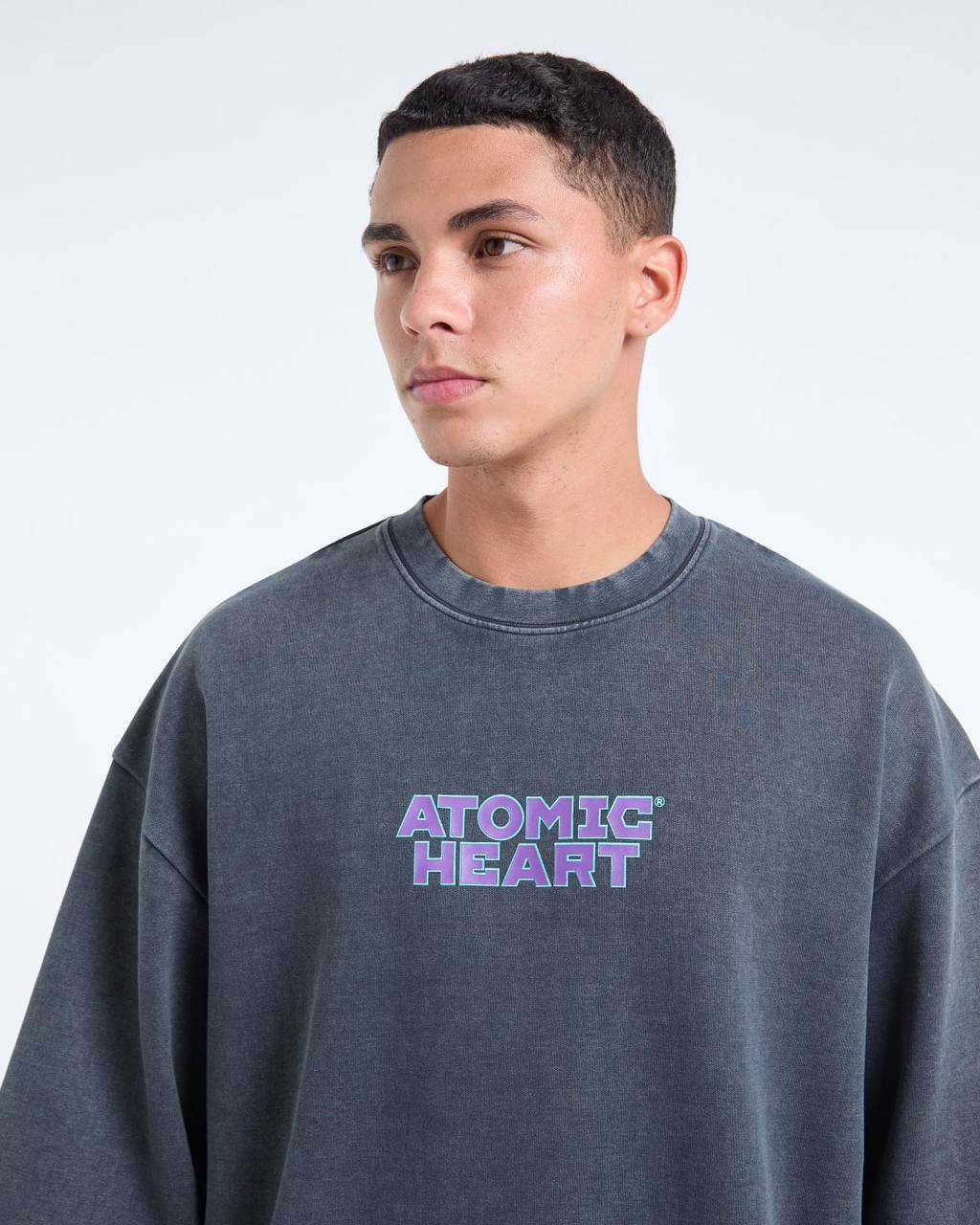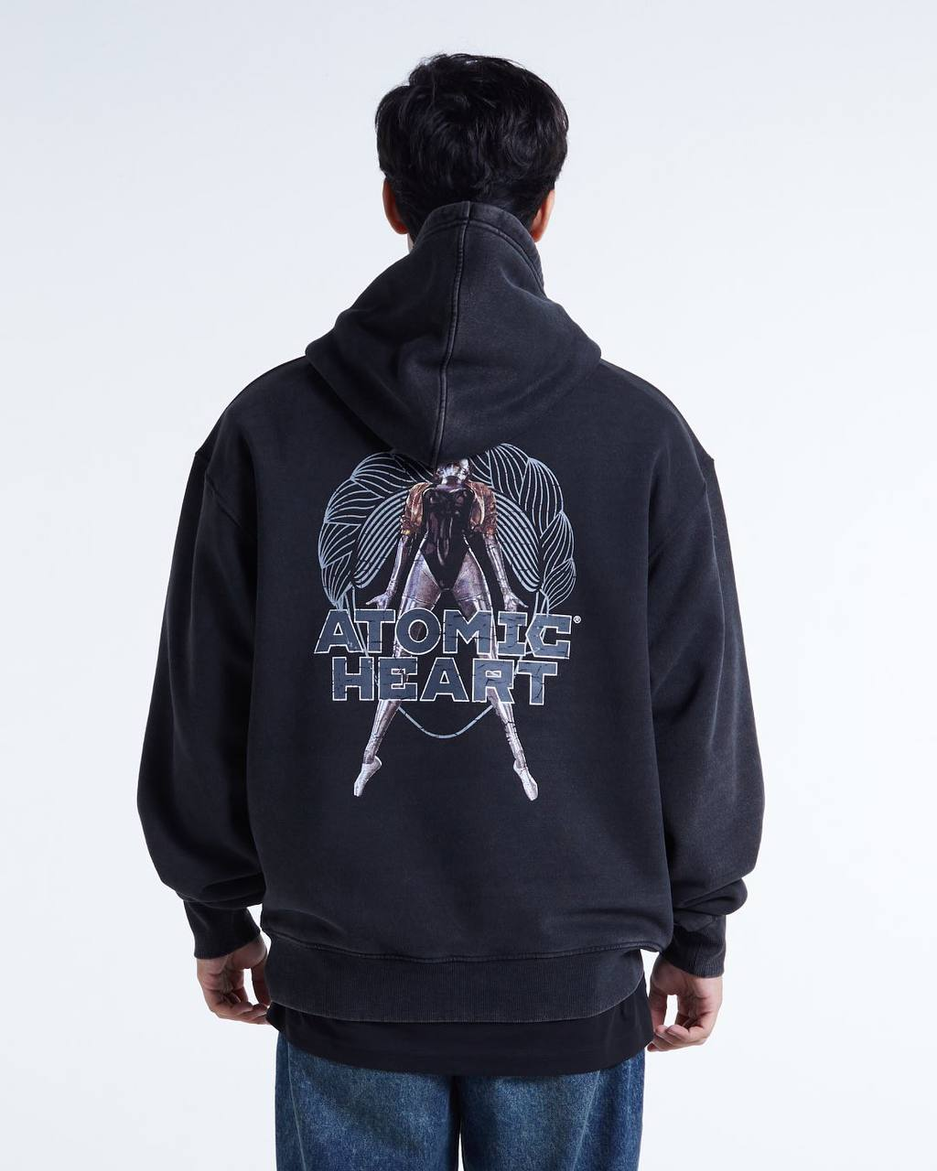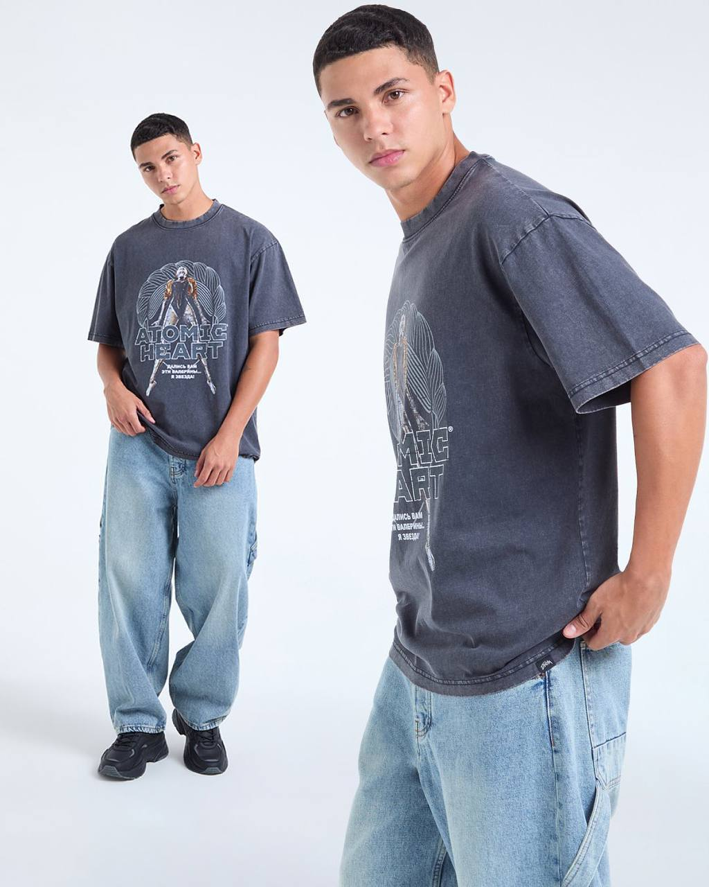 В ходе коллаба Atomic Heart x DUB (бренд одежды) представили несколько моделей: худи, темно-серая футболка, футболка оверсайз, светло-серая футболка.