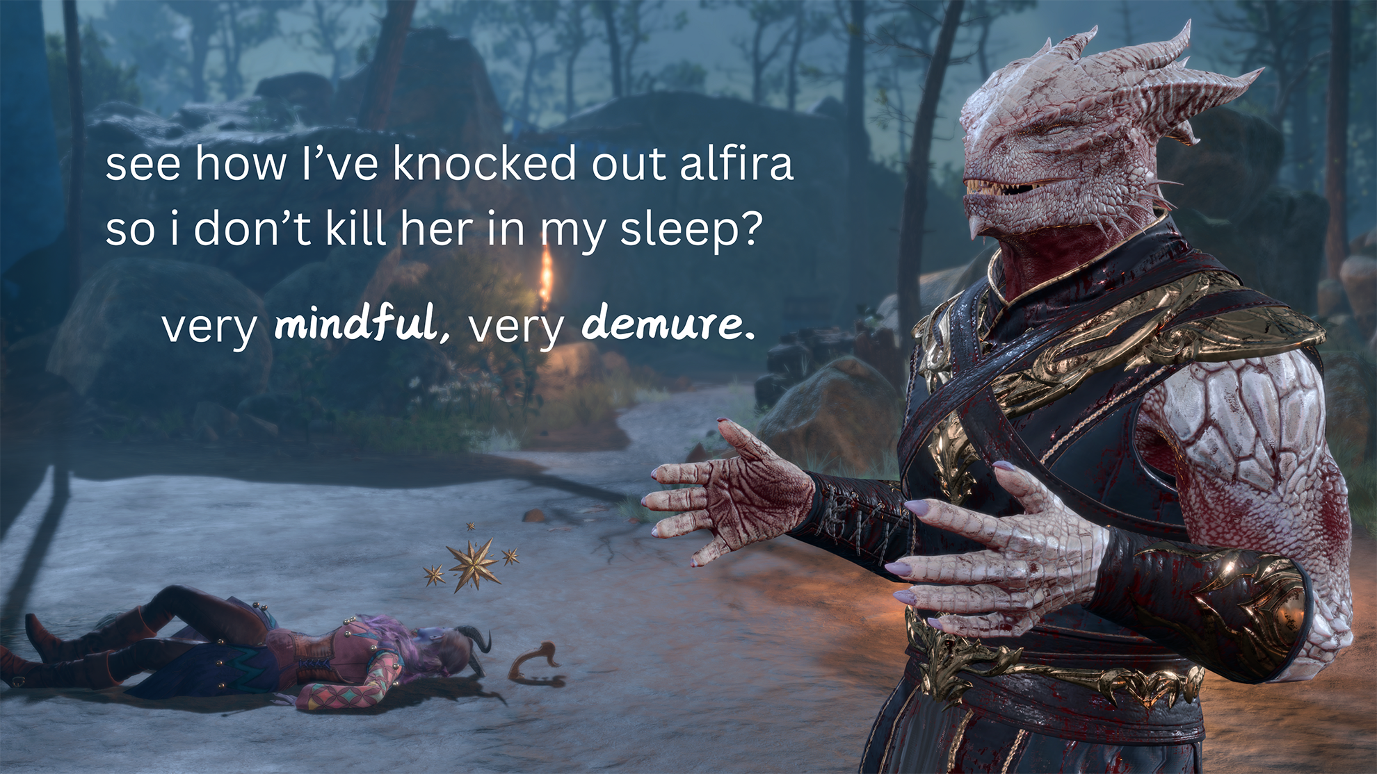 В наличии забавные ситуации и отсылки, например к известной в сообществе BG3 анимационной короткометражке «Perception check but the Dark Urge is a BARD».