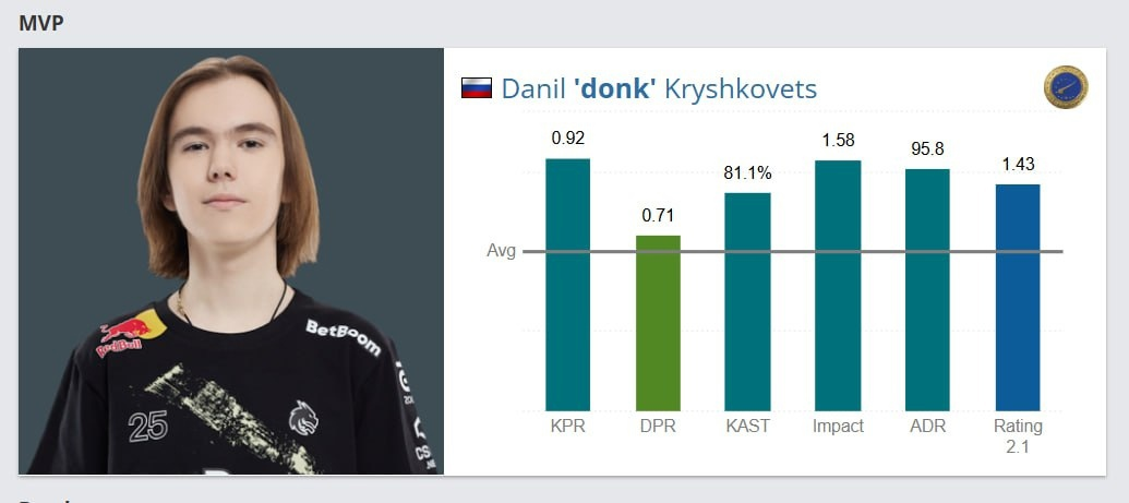 Данил «donk» Крышковец был признан лучшим игроком (MVP) BLAST Bounty Spring 2025 Райз отмечает, что это уже седьмая медаль в его карьере.