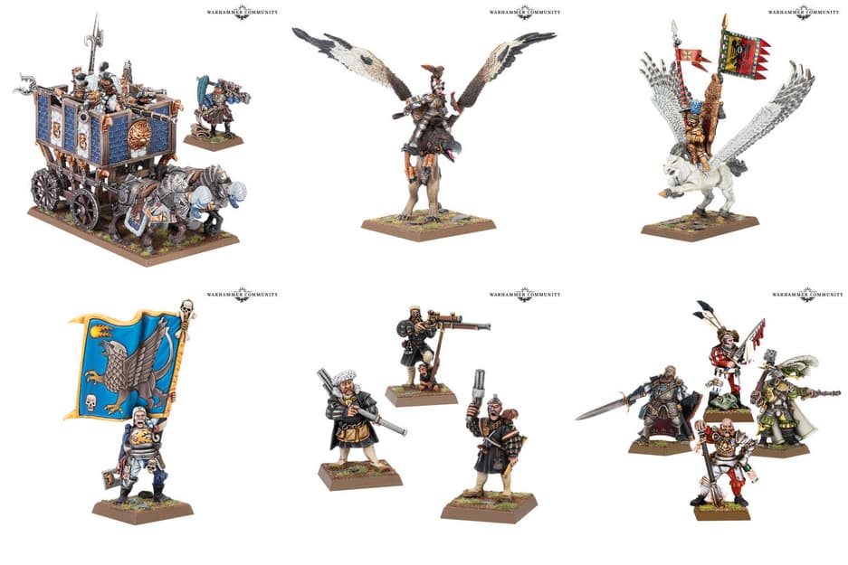 В Warhammer The Old World войска Империи получат переделанный Боевой вагон с новым инженером и следующие металлические миниатюры: генерал на грифоне, командир на пегасе, знаменосец, набор из трёх инженеров, набор командиров.